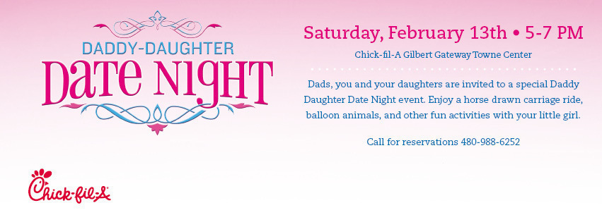 Daddy-Daughter Date Night at Chick-fil-A Restaurants Posted by TBN On 10/10/2013 Seatings are available every hour, and reservations are required. Customers can visit www.daddydaughterdate.com ... Retrieve Doc